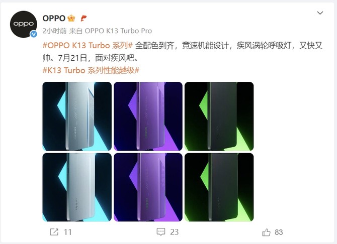 OPPO K13 Turbo 系列全配色到齐:自带风扇 疾风涡轮呼吸灯
